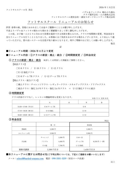 この度、お子様一人ひとりに合わせた指導を提供できる体制を整えるため、クラスや時間割の変更、料金改定を含むリニューアルを行うこととなりました。